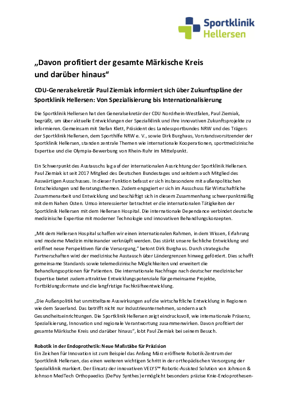 "Foreign policy has a direct impact on economic development in regions such as the Sauerland. This not only affects industrial companies, but also healthcare facilities. The Sportklinik Hellersen is an impressive example of how international presence, specialization, innovation and regional responsibility work together. This benefits the entire Märkische Kreis region and beyond," praised Paul Ziemiak during his visit.